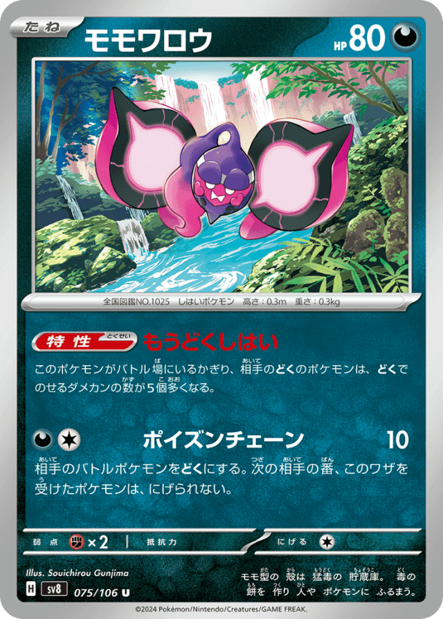 このポケモンがバトル場にいるかぎり、相手のどくのポケモンは、どくでのせるダメカンの数が5個多くなる。