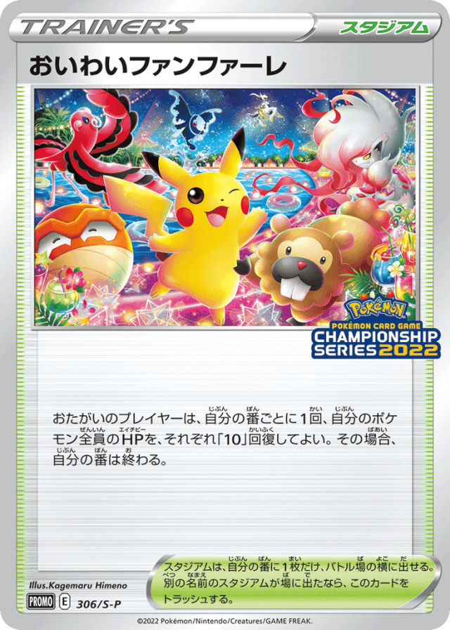 おたがいのプレイヤーは、自分の番ごとに1回、自分のポケモン全員のHPを、それぞれ「10」回復してよい。その場合、自分の番は終わる。 スタジアムは、自分の番に1枚だけ、バトル場の横に出せる。別の名前のスタジアムが場に出たなら、このカードをトラッシュする。