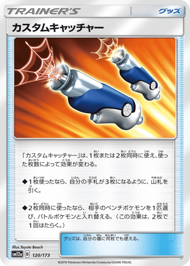 「カスタムキャッチャー」は、1枚または2枚同時に使え、使った枚数によって効果が変わる。 ◆1枚使ったなら、自分の手札が3枚になるように、山札を引く。 ◆2枚同時に使ったなら、相手のベンチポケモンを1匹選び、バトルポケモンと入れ替える。(この効果は、2枚で1回はたらく。) グッズは、自分の番に何枚でも使える。