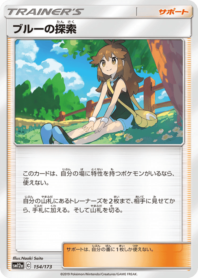 このカードは、自分の場に特性を持つポケモンがいるなら、使えない。 自分の山札にあるトレーナーズを2枚まで、相手に見せてから、手札に加える。そして山札を切る。 サポートは、自分の番に1枚しか使えない。
