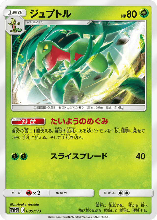 Sunshine Grace自分の番に1回使える。自分の山札にあるGrassポケモンを1枚、相手に見せてから、手札に加える。そして山札を切る。