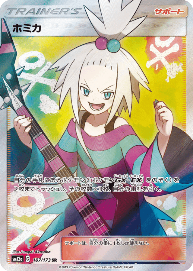 自分の手札にあるポケモン(「ポケモンGX・EX」をのぞく)を2枚までトラッシュし、その枚数×3枚、自分の山札を引く。 サポートは、自分の番に1枚しか使えない。