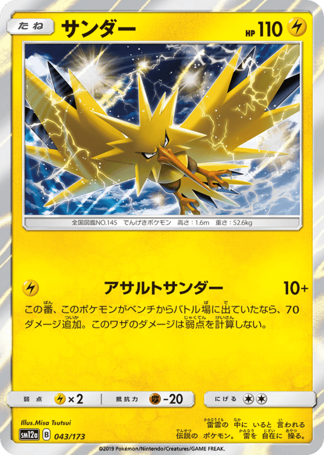 Thunderous Assault10+Cost: 1この番、このポケモンがベンチからバトル場に出ていたなら、70ダメージ追加。このワザのダメージは弱点を計算しない。