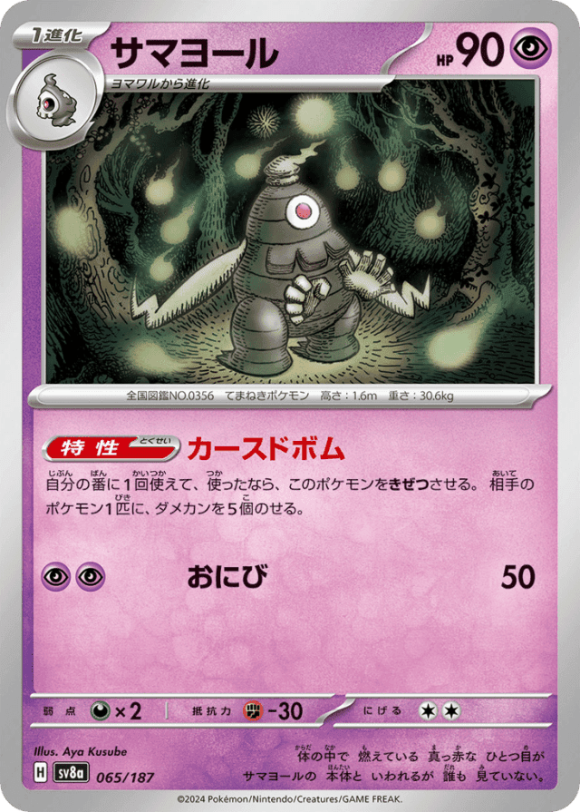 自分の番に1回使えて、使ったなら、このポケモンをきぜつさせる。相手のポケモン1匹に、ダメカンを5個のせる。
