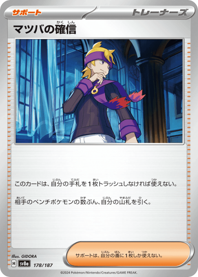 このカードは、自分の手札を1枚トラッシュしなければ使えない。 相手のベンチポケモンの数ぶん、自分の山札を引く。 サポートは、自分の番に1枚しか使えない。