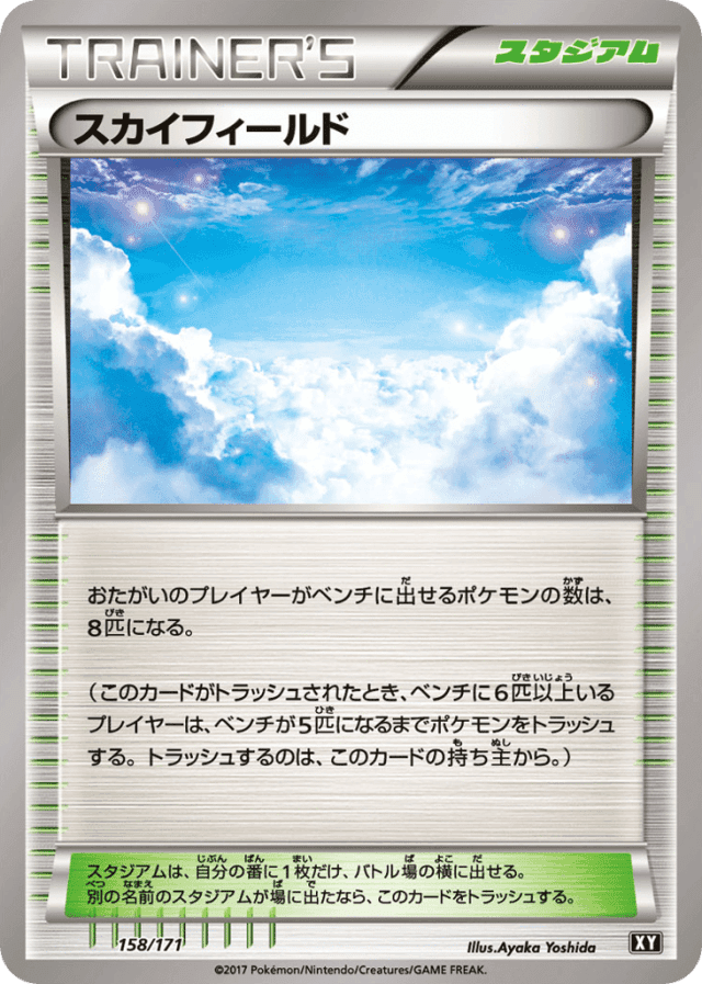 おたがいのプレイヤーがベンチに出せるポケモンの数は、8匹になる。 (このカードがトラッシュされたとき、ベンチに6匹以上いるプレイヤーは、ベンチが5匹になるまでポケモンをトラッシュする。トラッシュするのは、このカードの持ち主から。) スタジアムは、自分の番に1枚だけ、バトル場の横に出せる。別の名前のスタジアムが場に出たなら、このカードをトラッシュする。