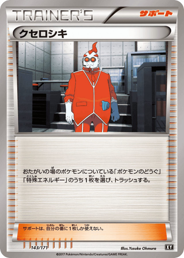 おたがいの場のポケモンについている「ポケモンのどうぐ」「特殊エネルギー」のうち1枚を選び、トラッシュする。 サポートは、自分の番に1枚しか使えない。