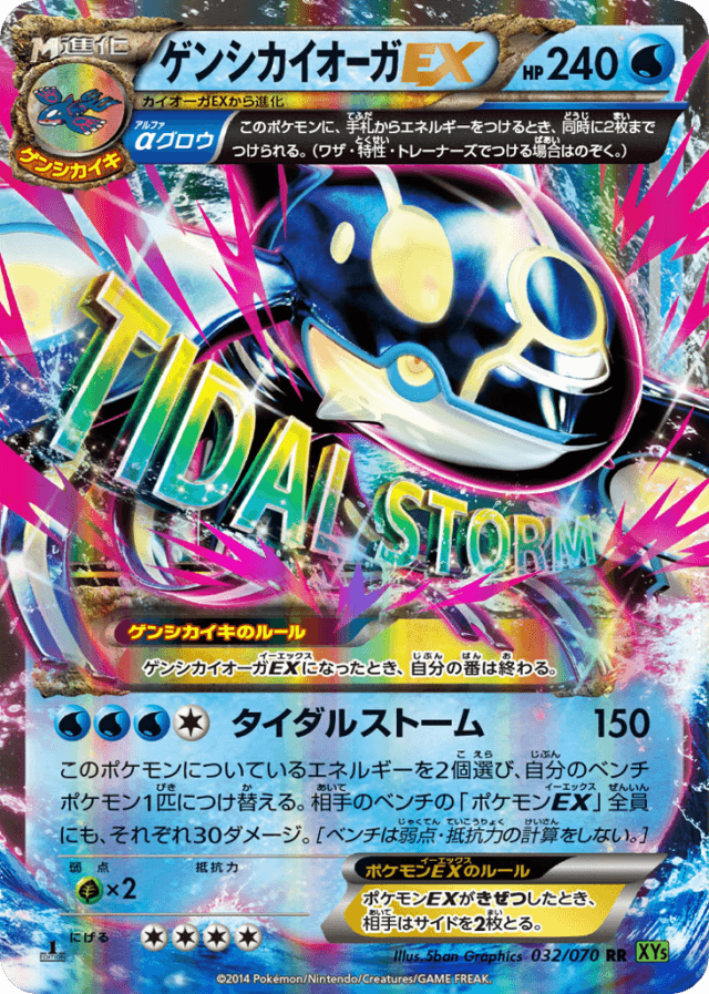 Tidal Storm150Cost: 4このポケモンについているエネルギーを2個選び、自分のベンチポケモン1匹につけ替える。相手のベンチの「ポケモンEX」全員にも、それぞれ30ダメージ。[ベンチは弱点・抵抗力の計算をしない。]