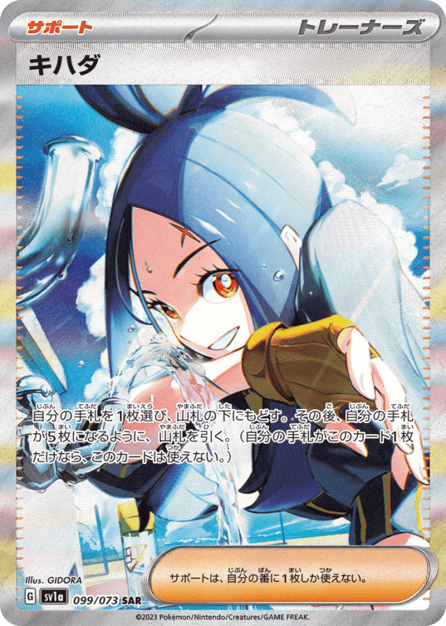 自分の手札を1枚選び、山札の下にもどす。その後、自分の手札が5枚になるように、山札を引く。(自分の手札がこのカード1枚だけなら、このカードは使えない。) サポートは、自分の番に1枚しか使えない。