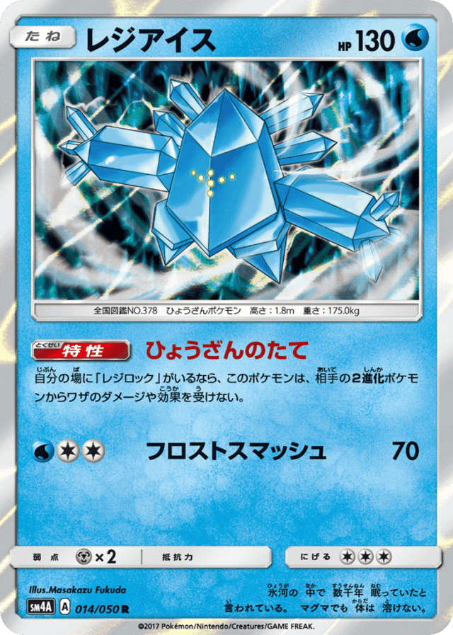 Iceberg Shield自分の場に「レジロック」がいるなら、このポケモンは、相手の2進化ポケモンからワザのダメージや効果を受けない。