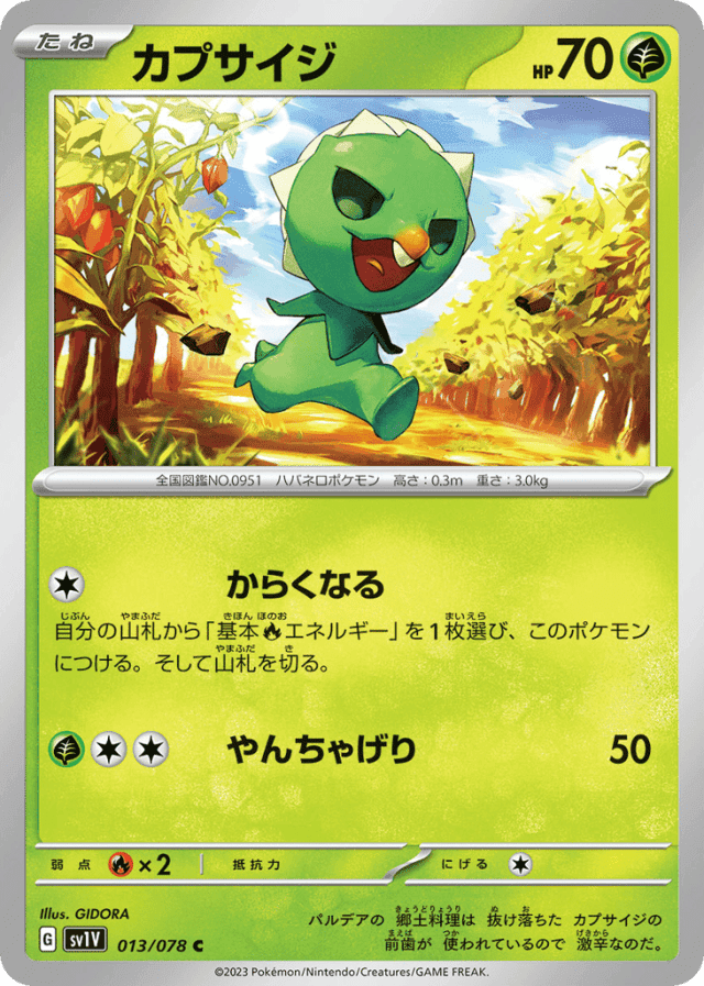 Get SpicyCost: 1自分の山札から「基本Fireエネルギー」を1枚選び、このポケモンにつける。そして山札を切る。