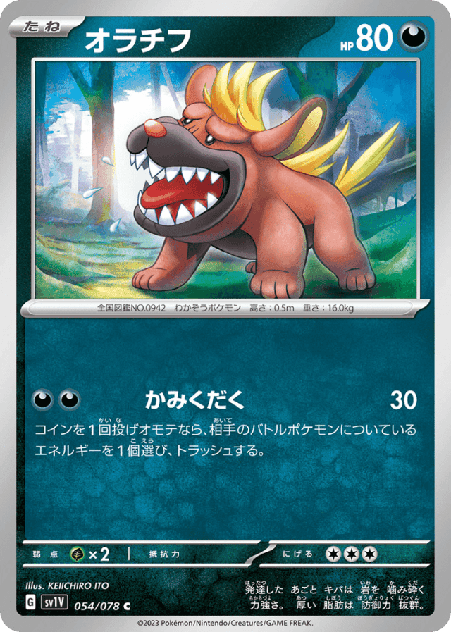 Crunch30Cost: 2コインを1回投げオモテなら、相手のバトルポケモンについているエネルギーを1個選び、トラッシュする。