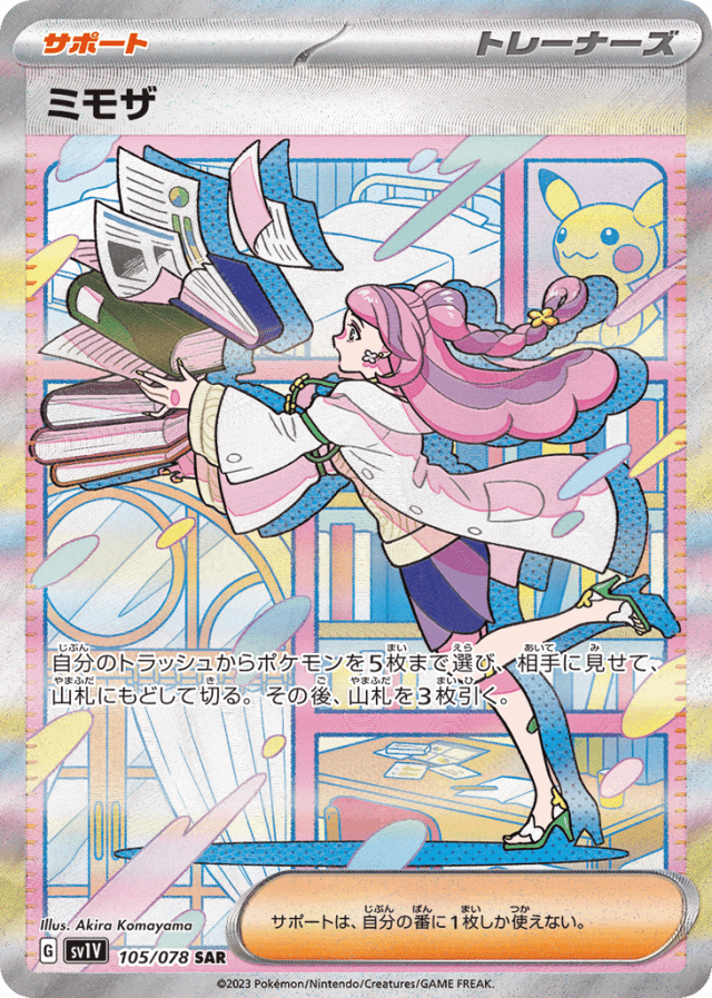 自分のトラッシュからポケモンを5枚まで選び、相手に見せて、山札にもどして切る。その後、山札を3枚引く。 サポートは、自分の番に1枚しか使えない。
