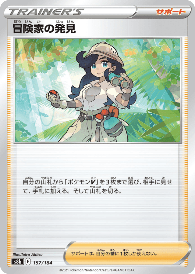 自分の山札から「ポケモンV」を3枚まで選び、相手に見せて、手札に加える。そして山札を切る。 サポートは、自分の番に1枚しか使えない。