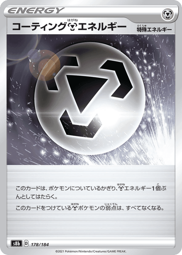 このカードは、ポケモンについているかぎり、Metalエネルギー1個ぶんとしてはたらく。 このカードをつけているMetalポケモンの弱点は、すべてなくなる。