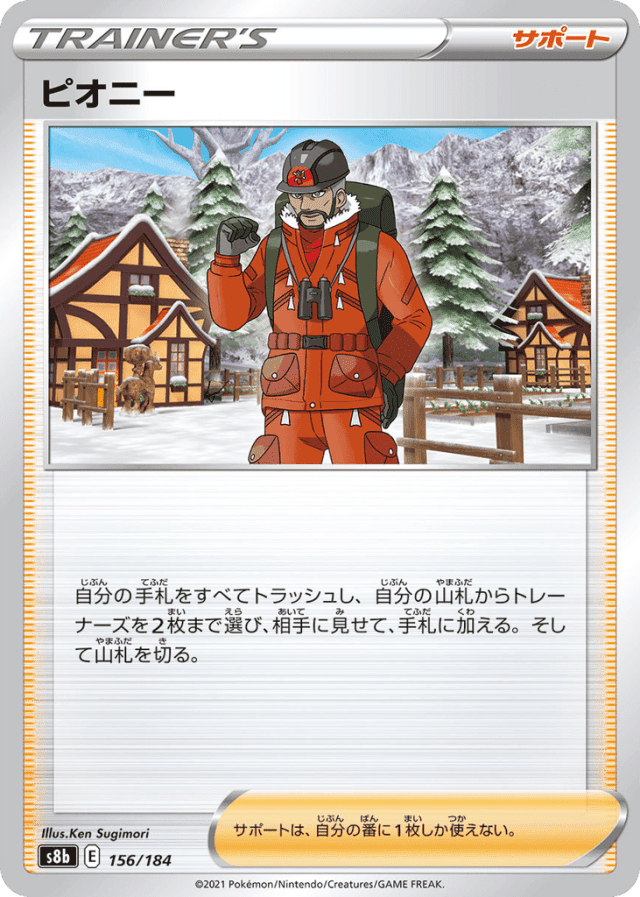 自分の手札をすべてトラッシュし、自分の山札からトレーナーズを2枚まで選び、相手に見せて、手札に加える。そして山札を切る。 サポートは、自分の番に1枚しか使えない。