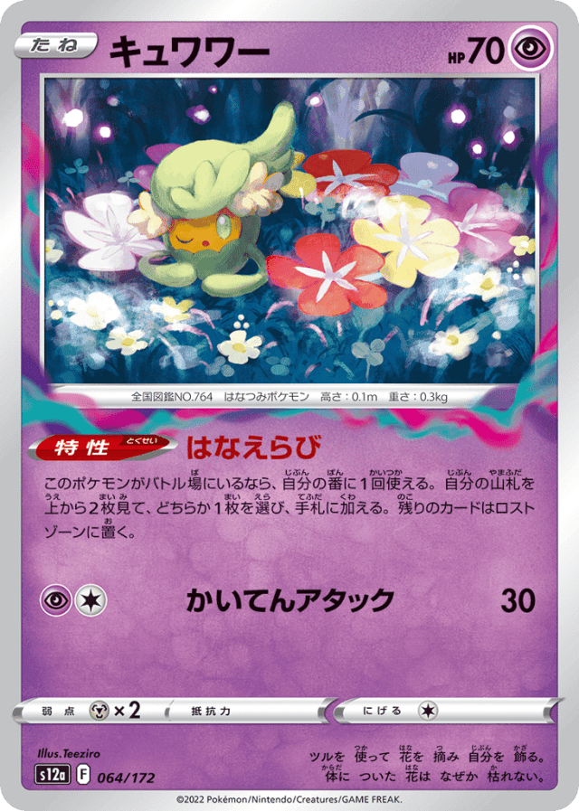 Flower Selectingこのポケモンがバトル場にいるなら、自分の番に1回使える。自分の山札を上から2枚見て、どちらか1枚を選び、手札に加える。残りのカードはロストゾーンに置く。