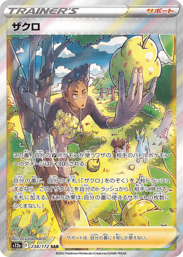 この番、自分のFightingポケモンが使うワザの、相手のバトルポケモンへのダメージは「+30」される。 自分の番に、自分の手札(「ザクロ」をのぞく)を2枚トラッシュするなら、この「ザクロ」を自分のトラッシュから、相手に見せて、手札に加える。(この効果は、自分の番に使えるサポートの枚数にふくまない。) サポートは、自分の番に1枚しか使えない。