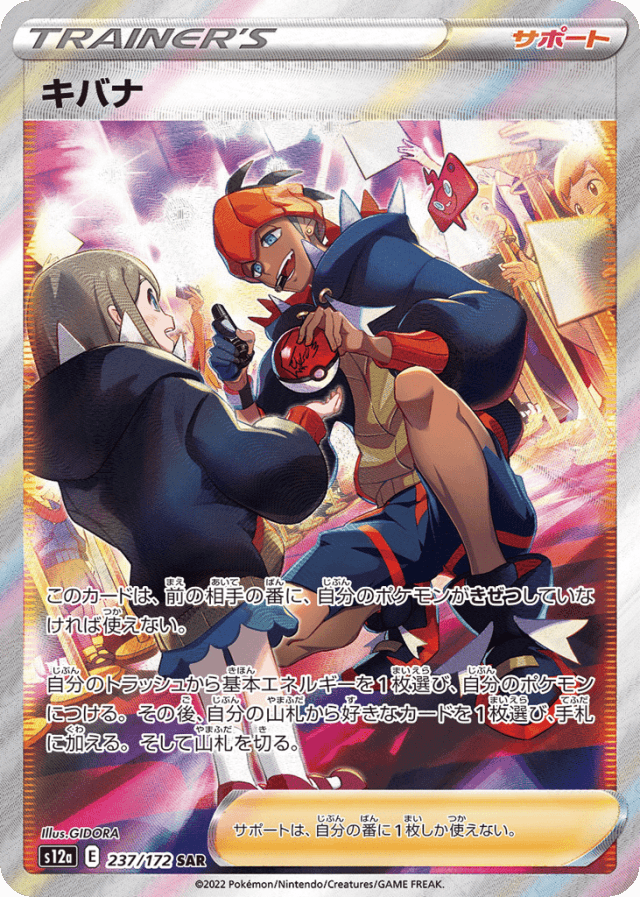 このカードは、前の相手の番に、自分のポケモンがきぜつしていなければ使えない。 自分のトラッシュから基本エネルギーを1枚選び、自分のポケモンにつける。その後、自分の山札から好きなカードを1枚選び、手札に加える。そして山札を切る。 サポートは、自分の番に1枚しか使えない。