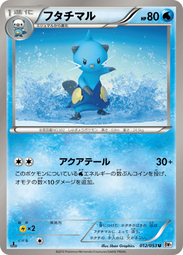 Aqua Tail30+Cost: 2このポケモンについているWaterエネルギーの数ぶんコインを投げ、オモテの数×10ダメージを追加。
