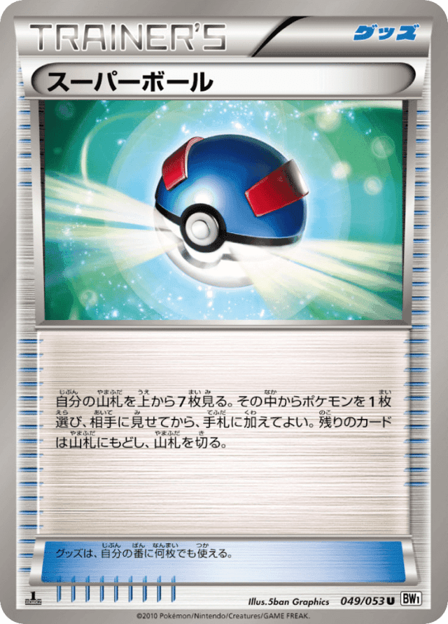 自分の山札を上から7枚見る。その中からポケモンを1枚選び、相手に見せてから、手札に加えてよい。残りのカードは山札にもどし、山札を切る。 グッズは、自分の番に何枚でも使える。