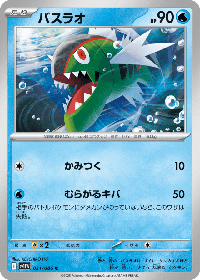 赤と 青の バスラオは すぐに ケンカするほど 仲が 悪い。 とても 乱暴な ポケモン。