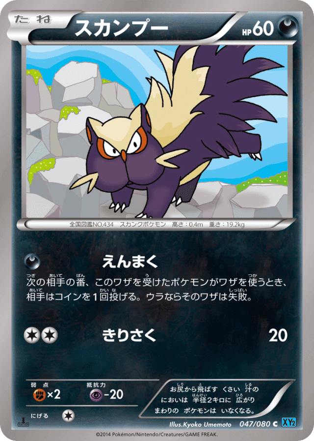 SmokescreenCost: 1次の相手の番、このワザを受けたポケモンがワザを使うとき、相手はコインを1回投げる。ウラならそのワザは失敗。