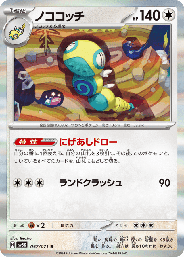 Run-Away Draw自分の番に1回使える。自分の山札を3枚引く。その後、このポケモンと、ついているすべてのカードを、山札にもどして切る。