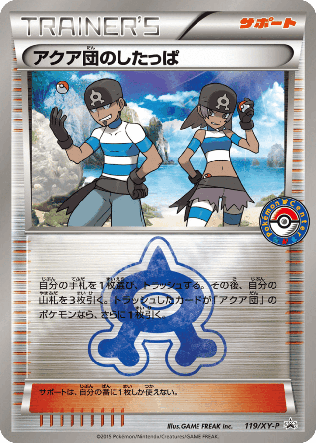 自分の手札を1枚選び、トラッシュする。その後、自分の山札を3枚引く。トラッシュしたカードが「アクア団」のポケモンなら、さらに1枚引く。 サポートは、自分の番に1枚しか使えない。