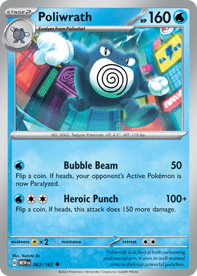 Poliwrath is skilled at both swimming and martial arts. It uses its well-trained arms to dish out powerful punches.