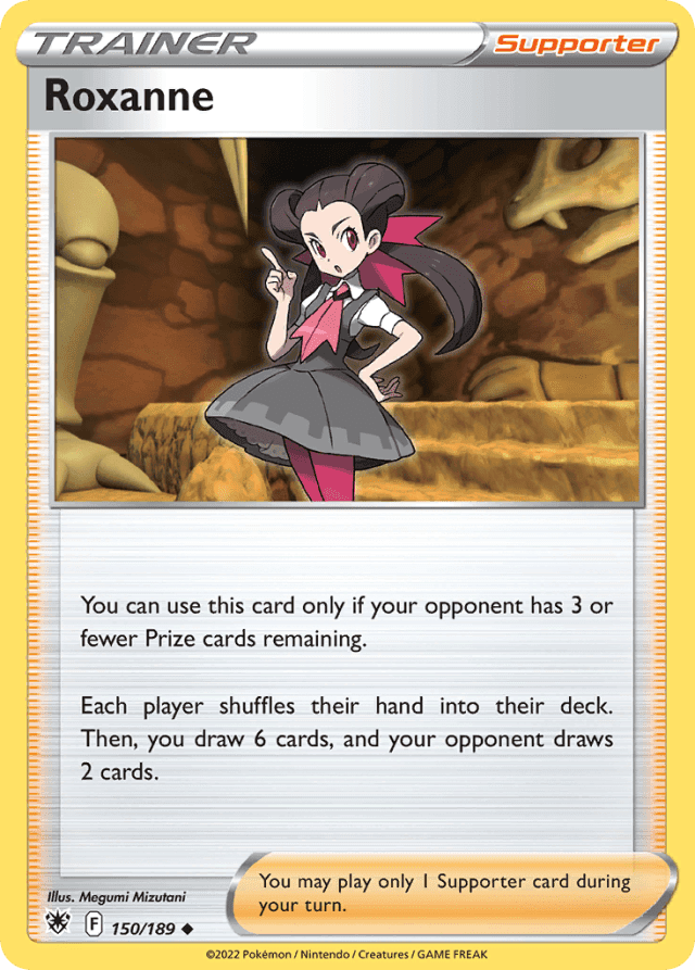 You can use this card only if your opponent has 3 or fewer Prize cards remaining. Each player shuffles their hand into their deck. Then, you draw 6 cards, and your opponent draws 2 cards. You may play only 1 Supporter card during your turn.