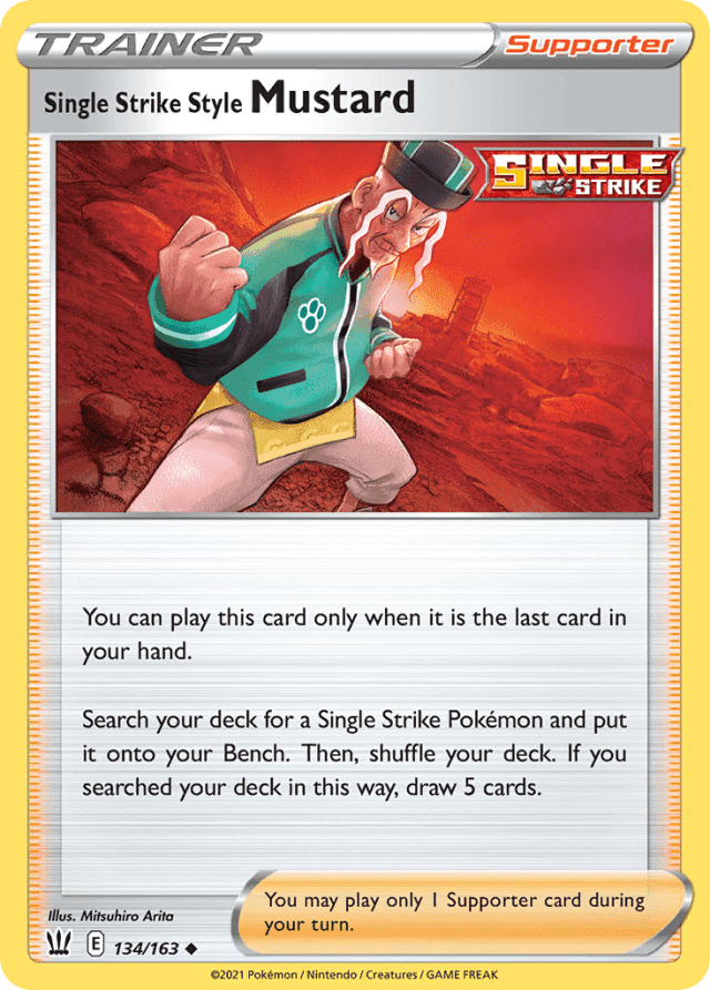 You can play this card only when it is the last card in your hand. Search your deck for a Single Strike Pokémon and put it onto your Bench. Then, shuffle your deck. If you searched your deck in this way, draw 5 cards. You may play only 1 Supporter card during your turn.