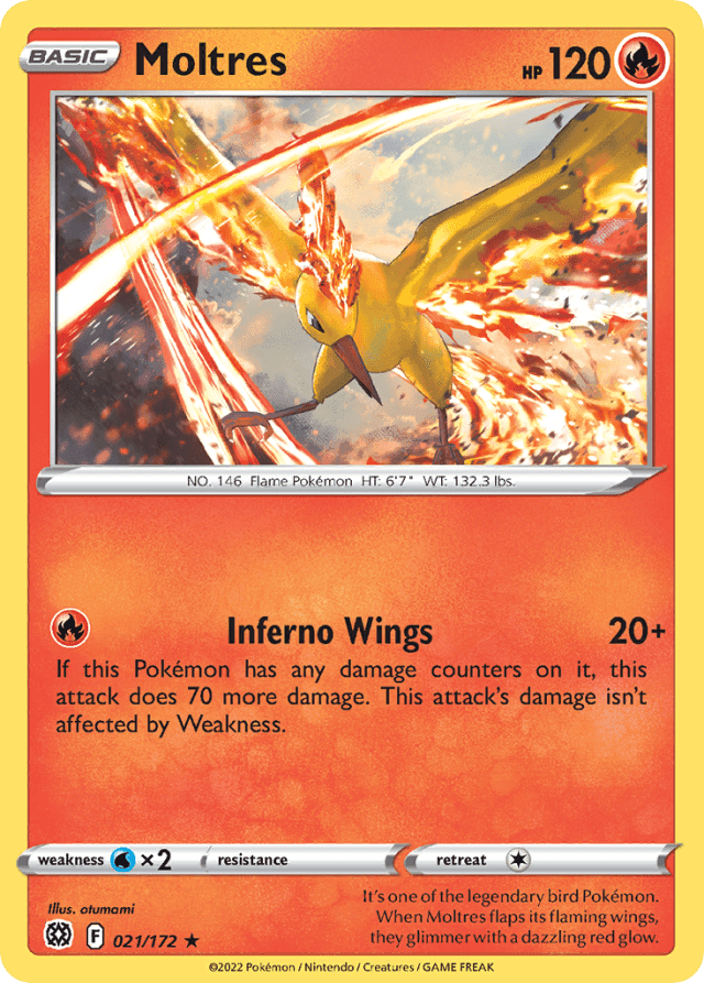 It's one of the legendary bird Pokémon. When Moltres flaps its flaming wings, they glimmer with a dazzling red glow.
