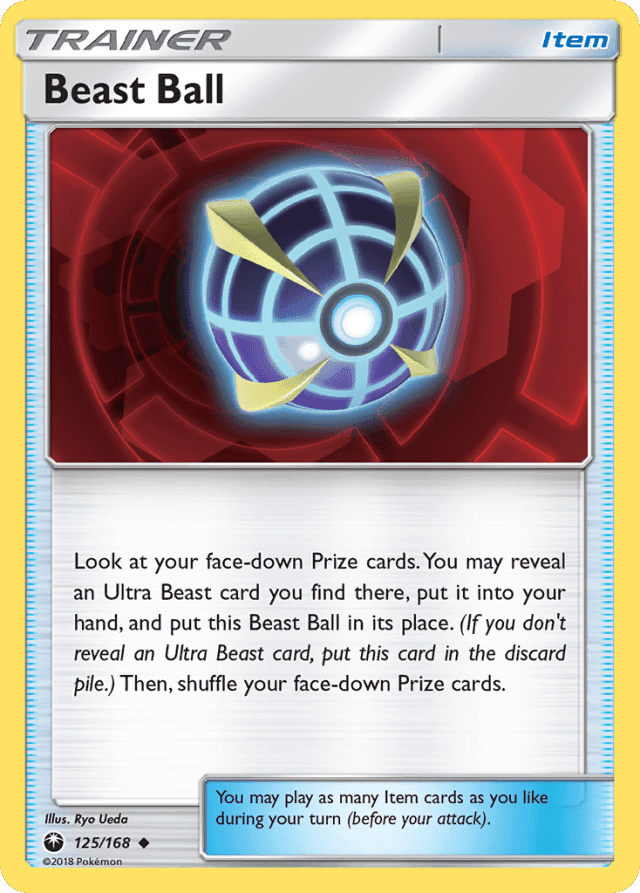 Look at your face-down Prize cards. You may reveal an Ultra Beast card you find there, put it into your hand, and put this Beast Ball in its place. (If you don't reveal an Ultra Beast card, put this card in the discard pile.) Then, shuffle your face-down Prize cards. You may play as many Item cards as you like during your turn (before your attack).
