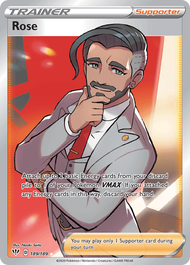 Attach up to 2 basic Energy cards from your discard pile to 1 of your Pokémon VMAX. If you attached any Energy cards in this way, discard your hand. You may play only 1 Supporter card during your turn.