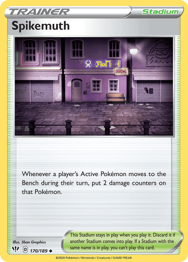 Whenever a player's Active Pokémon moves to the Bench during their turn, put 2 damage counters on that Pokémon. This Stadium stays in play when you play it. Discard it if another Stadium comes into play. If a Stadium with the same name is in play, you can't play this card.