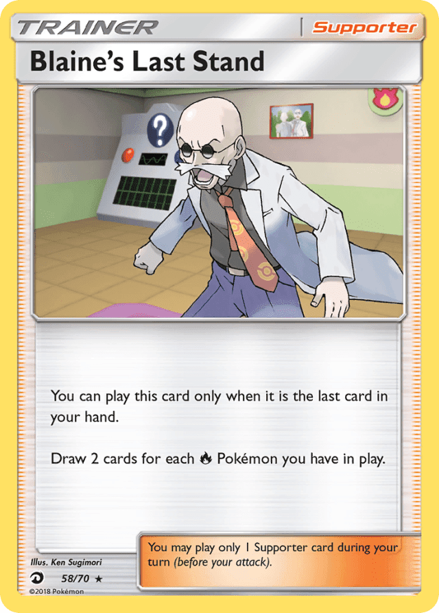 You can play this card only when it is the last card in your hand. Draw 2 cards for each Fire Pokémon you have in play. You may play only 1 Supporter card during your turn (before your attack).