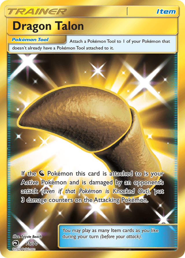 Attach a Pokémon Tool to 1 of your Pokémon that doesn't already have a Pokémon Tool attached to it. If the Dragon Pokémon this card is attached to is your Active Pokémon and is damaged by an opponent's attack (even if that Pokémon is Knocked Out), put 3 damage counters on the Attacking Pokémon. You may play as many Item cards as you like during your turn (before your attack).