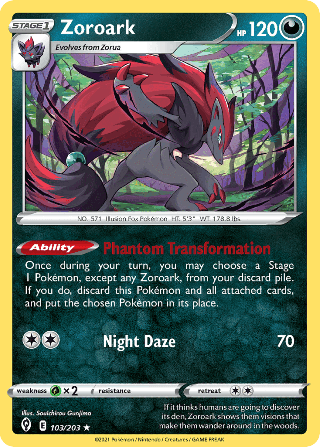 Once during your turn, you may choose a Stage 1 Pokémon, except any Zoroark, from your discard pile. If you do, discard this Pokémon and all attached cards, and put the chosen Pokémon in its place.