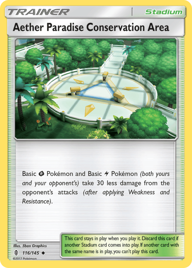 Basic Grass and Basic Lightning Pokémon (both yours and your opponent's) take 30 less damage from the opponent's attacks (after applying Weakness and Resistance). This card stays in play when you play it. Discard this card if another Stadium card comes into play. If another card with the same name is in play, you can't play this card.