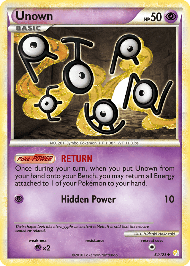 Once during your turn, when you put Unown from your hand onto your Bench, you may return all Energy attached to 1 of your Pokémon to your hand.