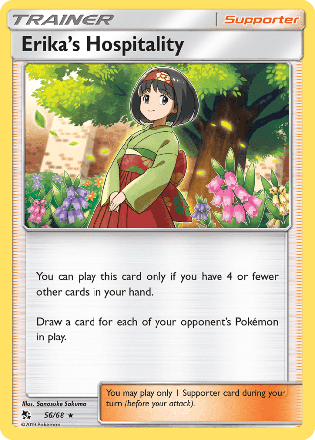 You can play this card only if you have 4 or fewer other cards in your hand. Draw a card for each of your opponent's Pokémon in play. You may play only 1 Supporter card during your turn (before your attack).