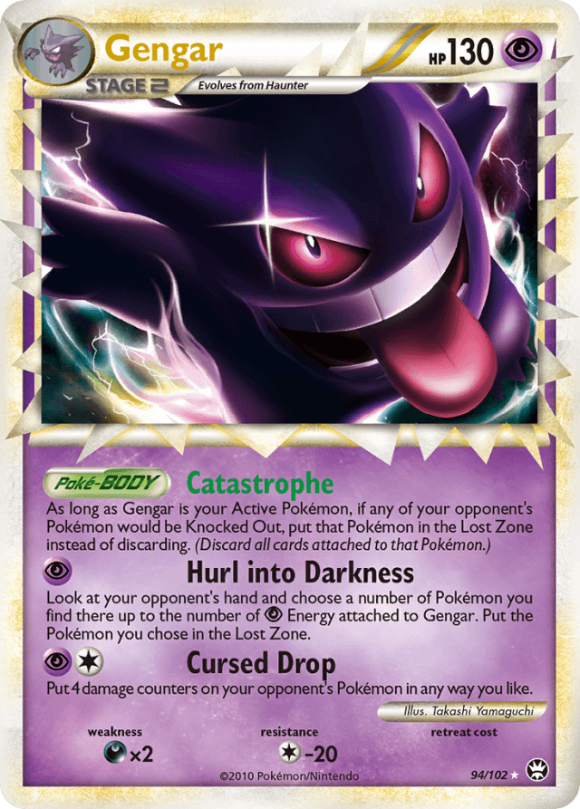 As long as Gengar is your Active Pokémon, if any of your opponent's Pokémon would be Knocked Out, put that Pokémon in the Lost Zone instead of discarding. (Discard all cards attached to that Pokémon.)