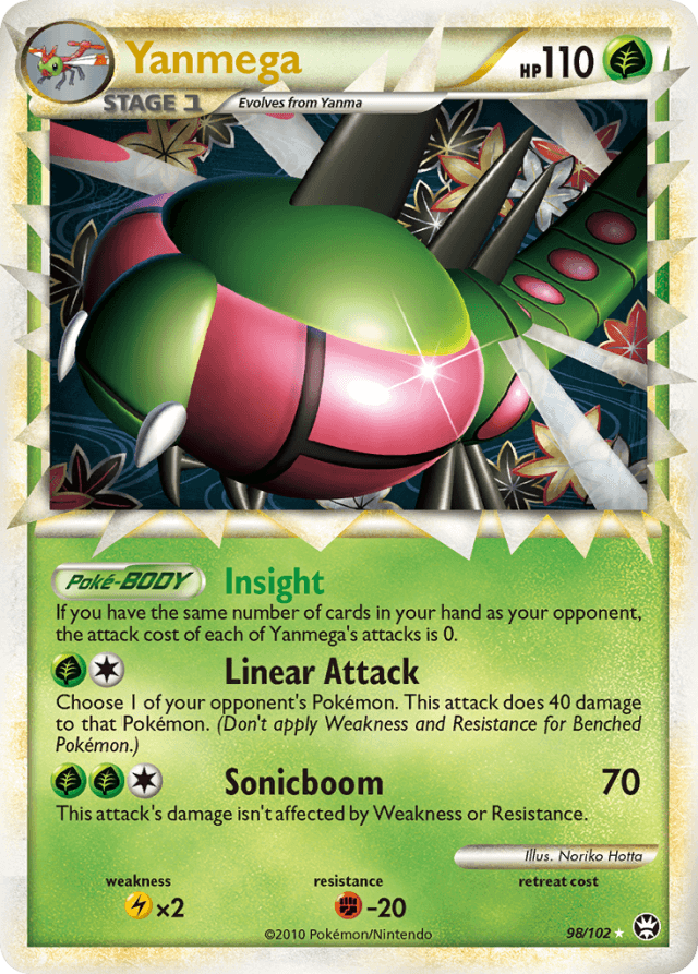 If you have the same number of cards in your hand as your opponent, the attack cost of each of Yanmega's attacks is 0.