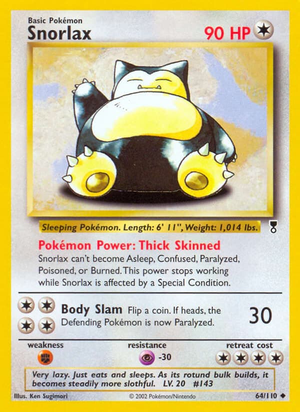 Snorlax can't become Asleep, Confused, Paralyzed, Poisoned, or Burned. This power stops working while Snorlax is affected by a Special Condition.
