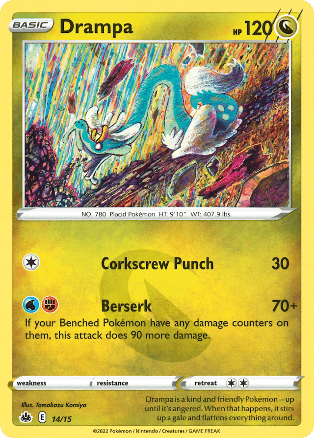 Drampa is a kind and friendly Pokémon—up until it's angered. When that happens, it stirs up a gale and flattens everything around.