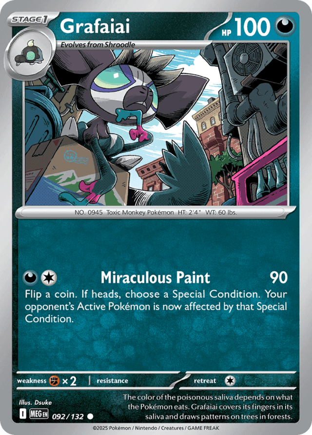 The color of the poisonous saliva depends on what the Pokémon eats. Grafaiai covers its fingers in its saliva and draws patterns on trees in forests.