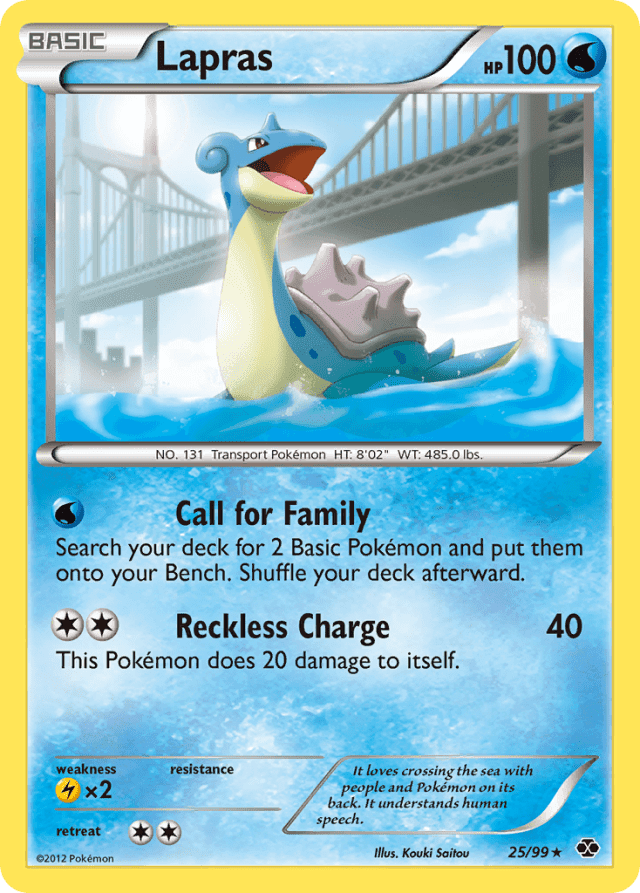 It loves crossing the sea with people and Pokémon on its back. It understands human speech.
