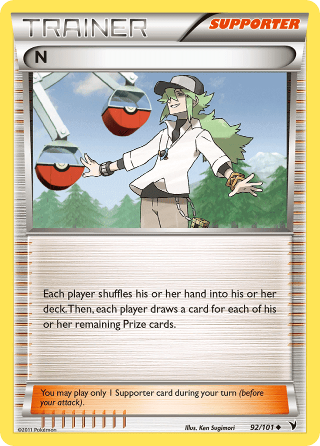 Each player shuffles his or her hand into his or her deck. Then, each player draws a card for each of his or her remaining Prize cards. You may play only 1 Supporter card during your turn (before your attack).