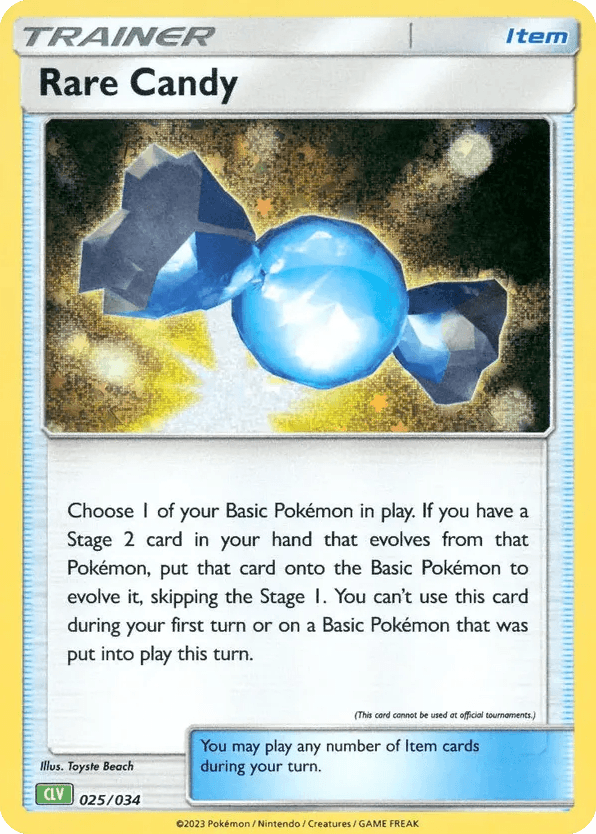 Choose 1 of your Basic Pokémon in play. If you have a Stage 2 card in your hand that evolves from that Pokémon, put that card onto the Basic Pokémon to evolve it, skipping the Stage 1. You can't use this card during your first turn or on a Basic Pokémon that was put into play this turn.